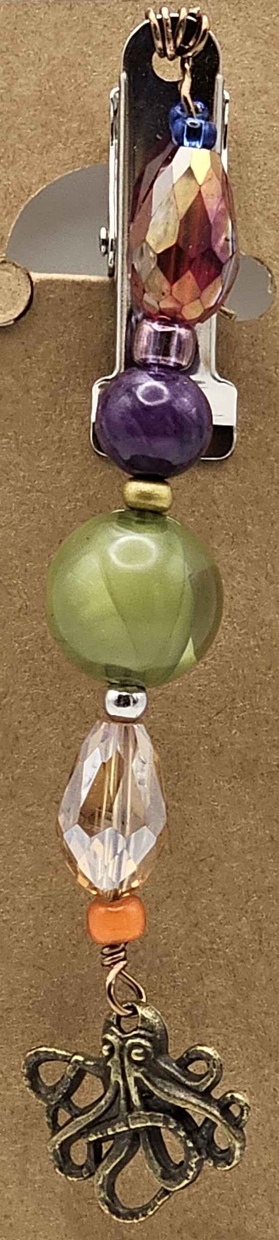 A dangle charm with various beads made of glass, stone, wood, plastic, and/or ceramic clay beads. Various copper wire colors are used to assemble. Use this charm to accentuate pirate headwear attire or like Pieces of Eight. Clay beads are made by the Midnight Potter. Each Pirate Charm is designed and assembled by the Midnight Potter artist. Allow for variations of bead combinations not shown individually. Decide which attachment type you would prefer and the kind of dangle charm at the end you would like. Length of charms is 4-6" long.